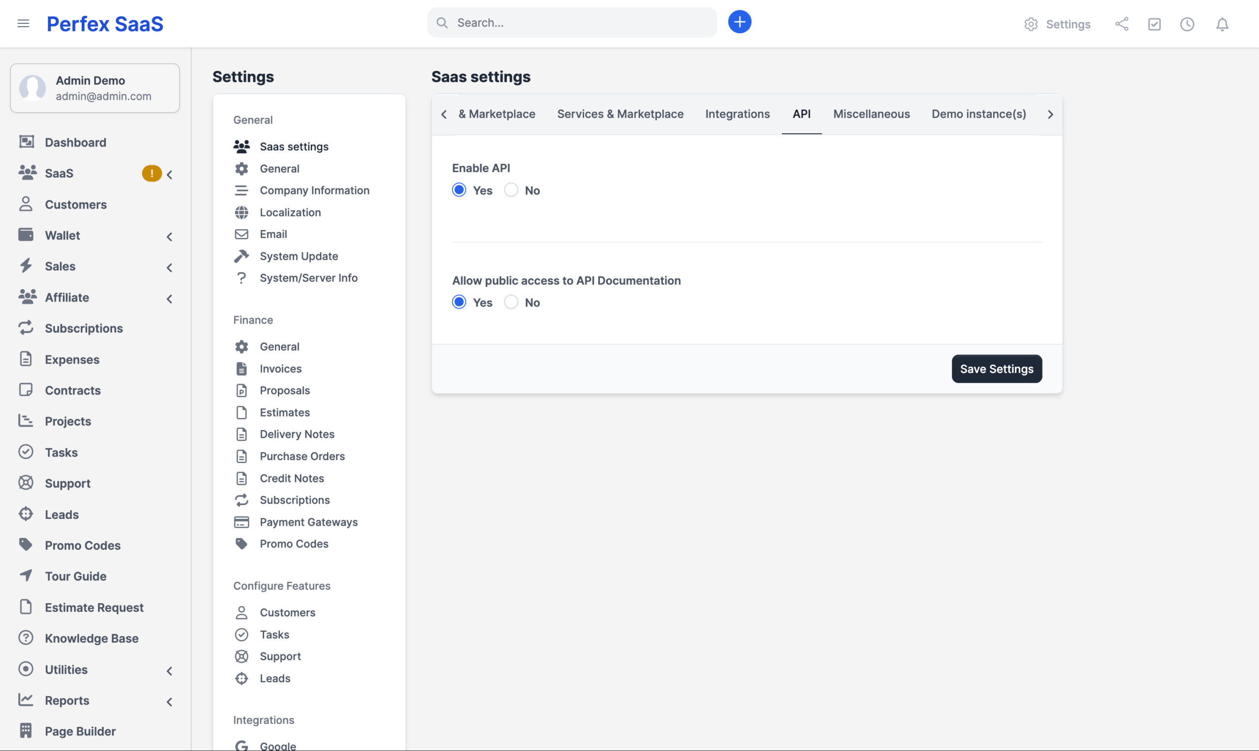 The API is documentation (Open API Specification 3 – OAS3) is inclusive and can be configured directly from your SaaS settings page (API tab).